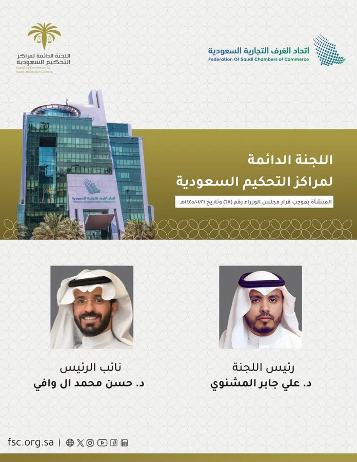 بالتزكية: د. علي المشنوي رئيسا للجنة الدائمة لمراكز التحكيم ود.حسن آل وافي نائبا للرئيس. اللجنة أنشئت بموجب قرار مجلس الوزراء الموقر رقم(٦٨) وتاريخ ١٤٤٥/٠١/٢١هـ، وستعمل على مواصلة دورها في التشريع والترخيص لمراكز التحكيم وتوفير بيئة تحكيمية بمعايير عالمية.